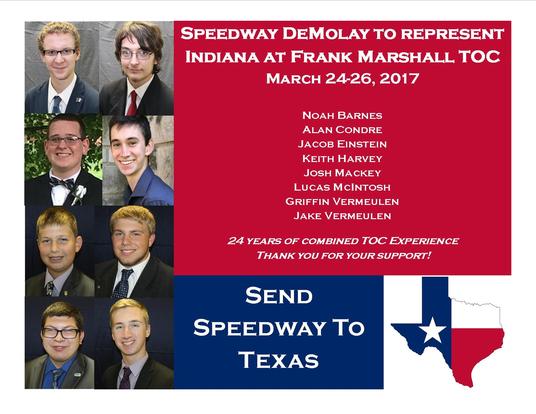 Speedway DeMolay is proud to announce the team of eight elite ritualists who will be representing Indiana DeMolay at the Frank Marshal Tournament of Champions to be held in Arlington Texas on the weekend of March 24-26, 2017.